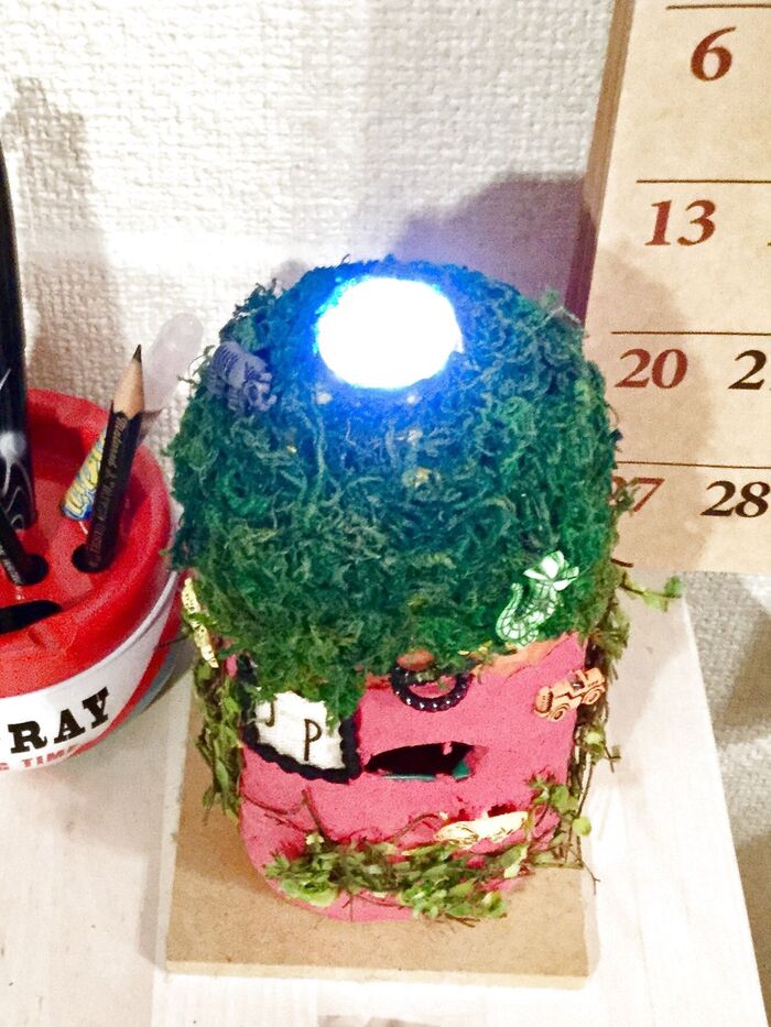 ライトの裏側には、紙粘土で埋め込みます。ライトの電池の取り替えには下の部分を取り外す構造のライトですので、取り外す部分には埋め込み注意です。