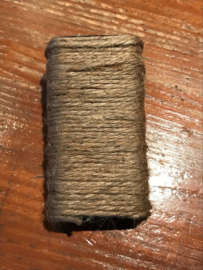 まず、途中(蓋の方)から麻紐を巻き始めます。この時、1番端の麻紐に重ねて巻き、スルスル麻紐が取れないようにします。