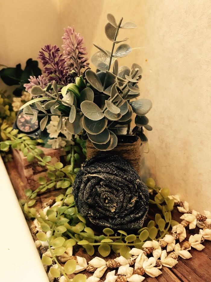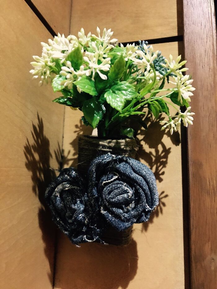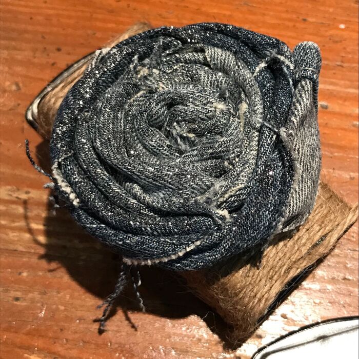 デニムフラワーを麻紐を巻いたタブレット缶にボンドで付けます。