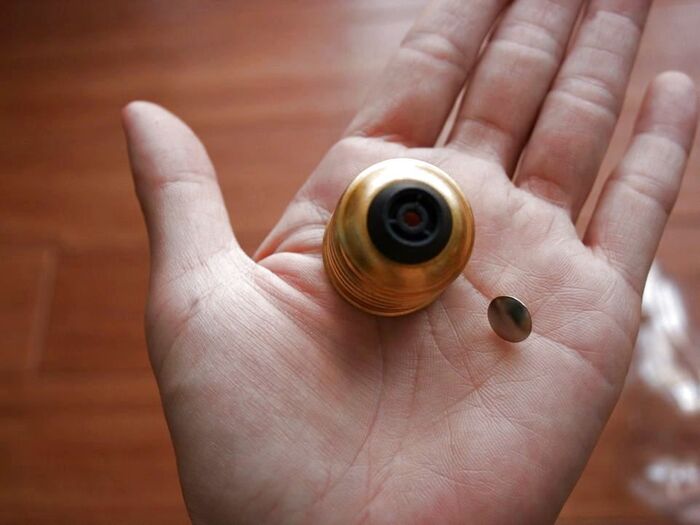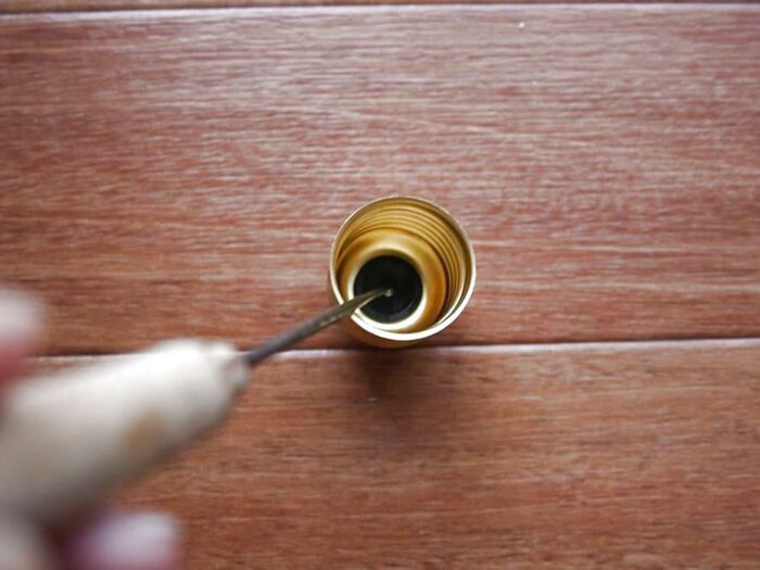 蓋の裏をみると銀色部分がとれそうな突起が出ていたのでキリのような物で押してみました