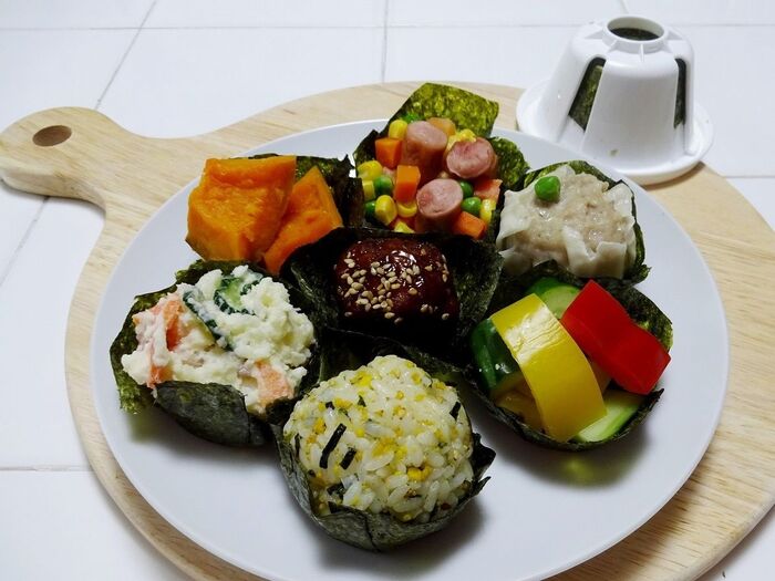 おにぎり、おかずなどお好みでもりつけてくださいね。食卓のアクセントに、お弁当のカップに便利です。