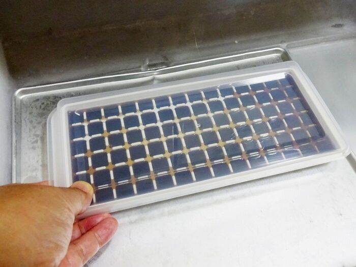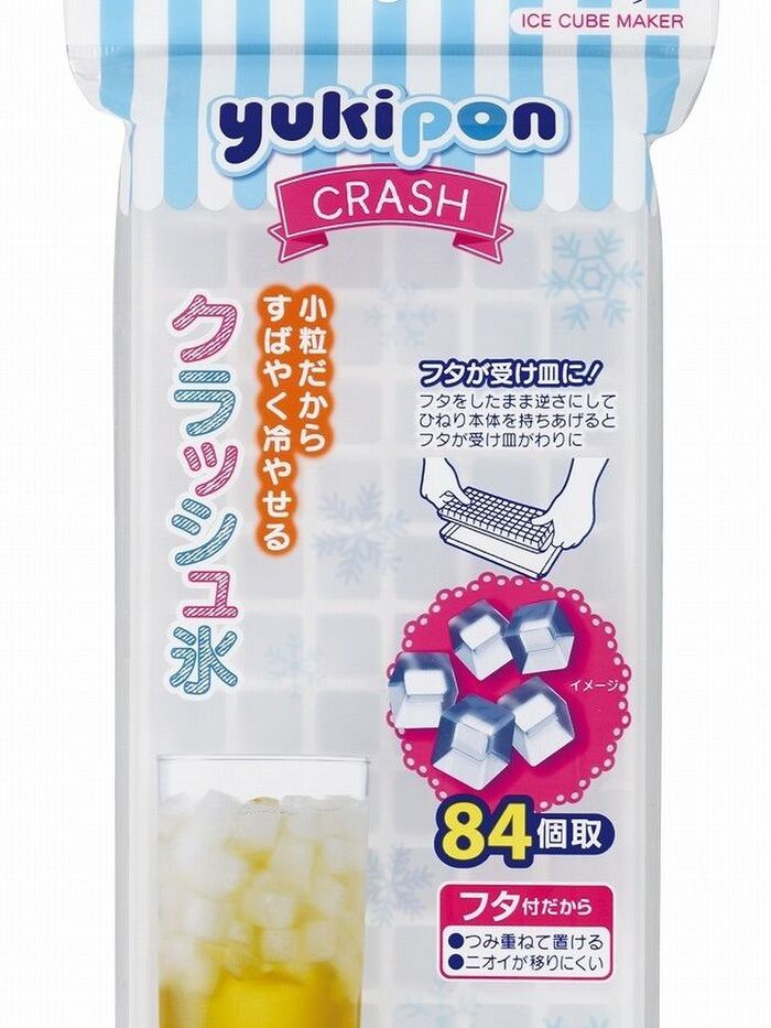 ここで使ったアイストレーは「ゆきポン クラッシュ氷」。約1cm角の小さな氷84個取れます。フタ付きで衛生的。