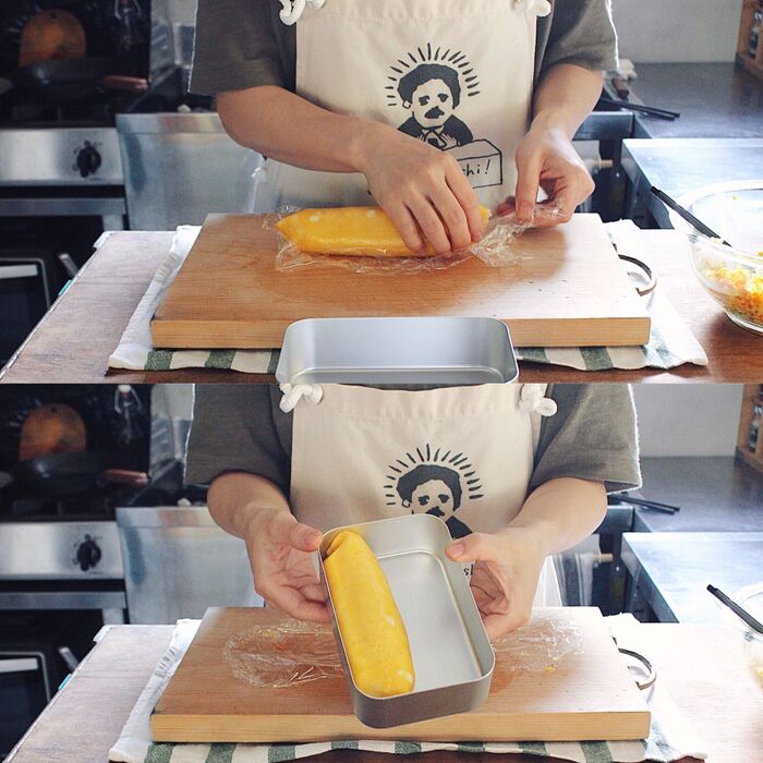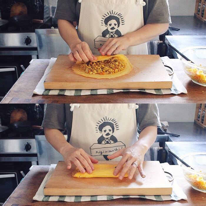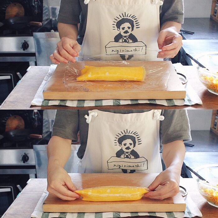 包むというよりもラップでパタパタクルッとして両端をキュっとしてムギュッと詰めるイメージです。お弁当箱の大きさギリギリに作って、ムギュッと詰めたら崩れません。