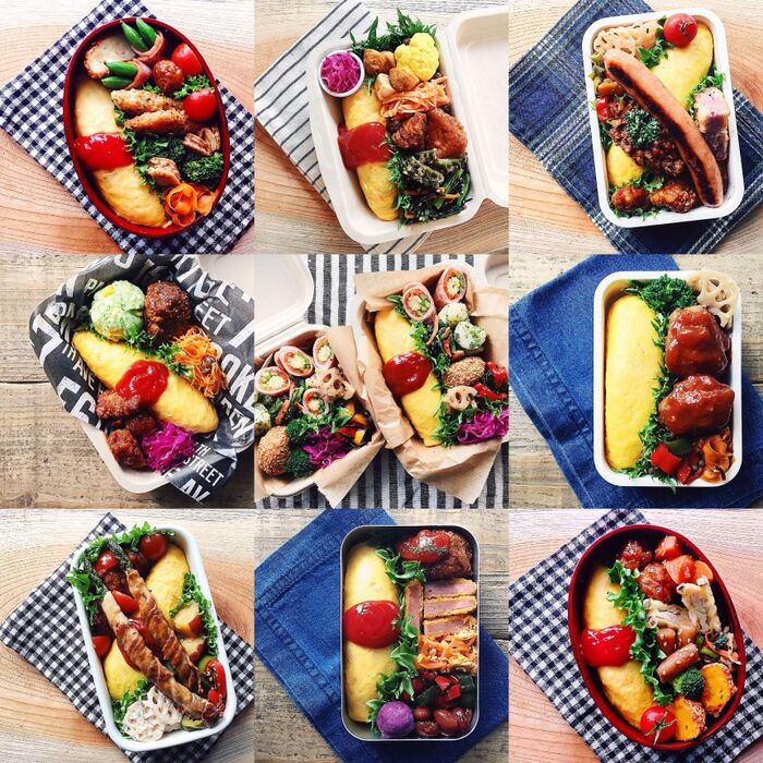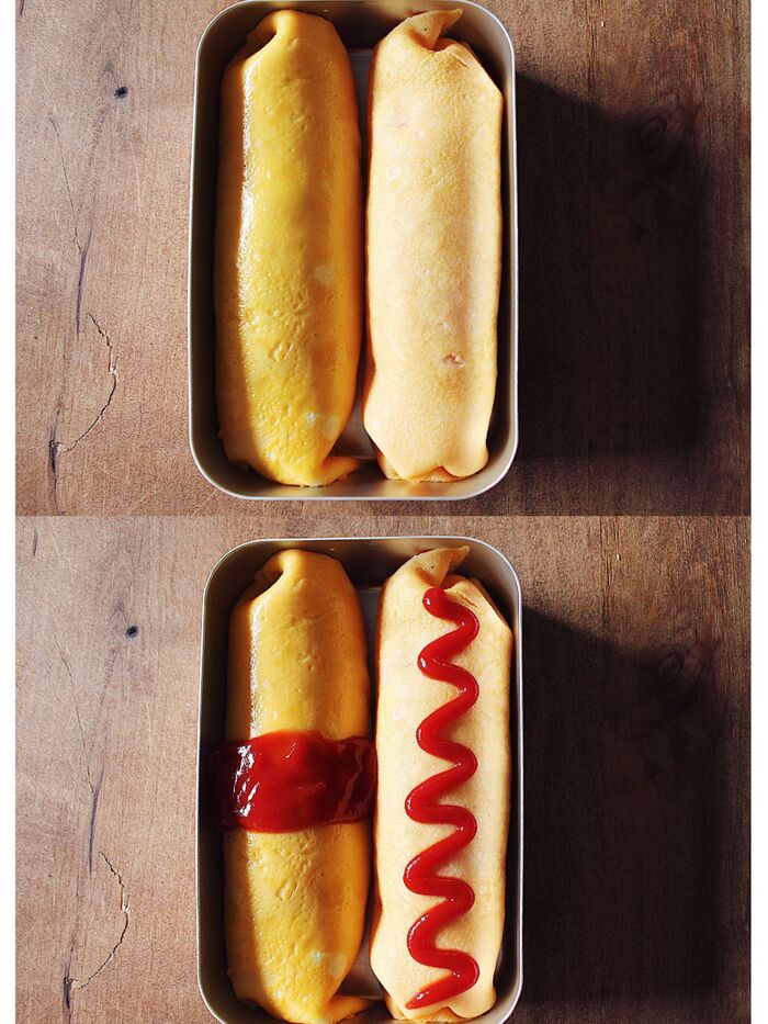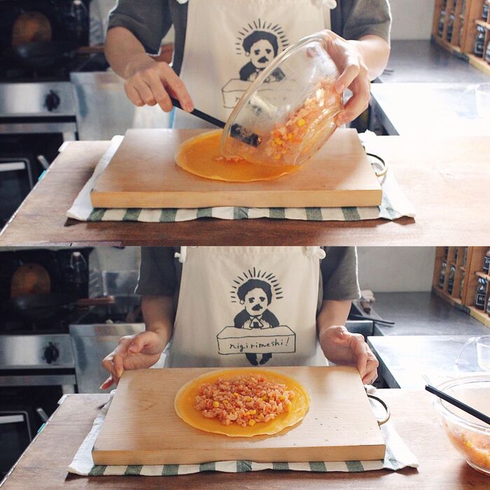 お弁当箱の大きさによって、ご飯の量や薄焼き卵の大きさを変えて包んでください。