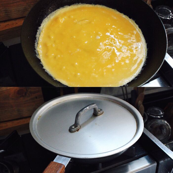 卵液を流し入れて、表面が固まったら蓋をして火を消して余熱で卵に火を通します。