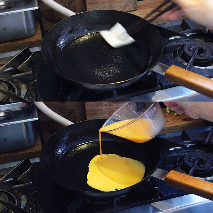 油を入れてなじませずに卵液を入れると焼きむらにつながるのでご注意を。