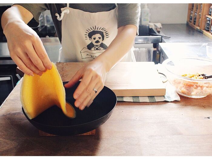 卵液をゆっくり入れて、均一に広がるようにフライパンを動かしてください。