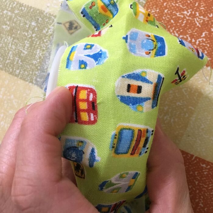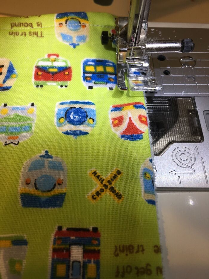 ⑱返し口に、アイロンをかけ、まわりを返し縫いありで、0.5cmで、縫っていく。