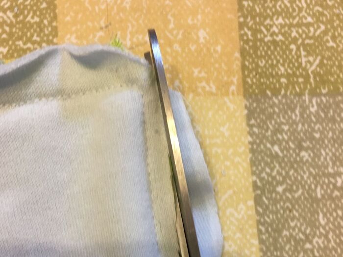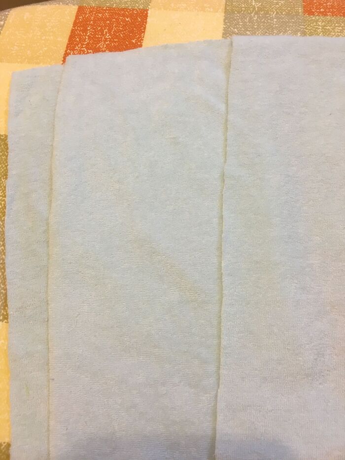 ⑩パイル地に、アイロンをかけ、ガーゼハンカチと同じ大きさに、3枚裁断する。
