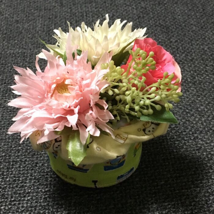 ⑪オアシスをお好みの大きさに切りに、容器に入れ、造花を挿していく。