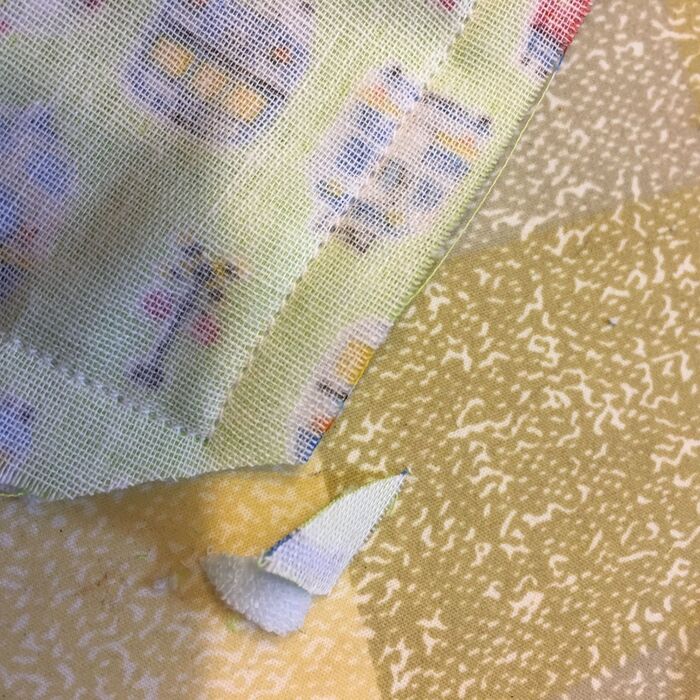 ⑯裏返して縫う際、きれいに仕上がるように、周りの生地を半分ずつ切っていく。