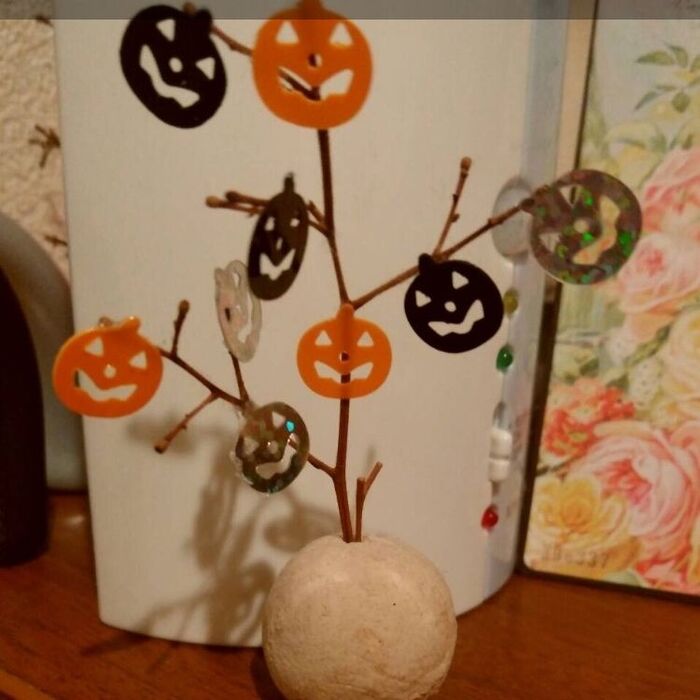 パーツをボンドで直接枝につけてないので、ハロウィンが終わったら簡単にパーツを外す事ができるので、ポットは元に戻せます。