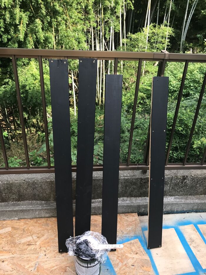 板を支柱と支柱の間の長さより少し長めにカットして、好きなカラーに塗ります。