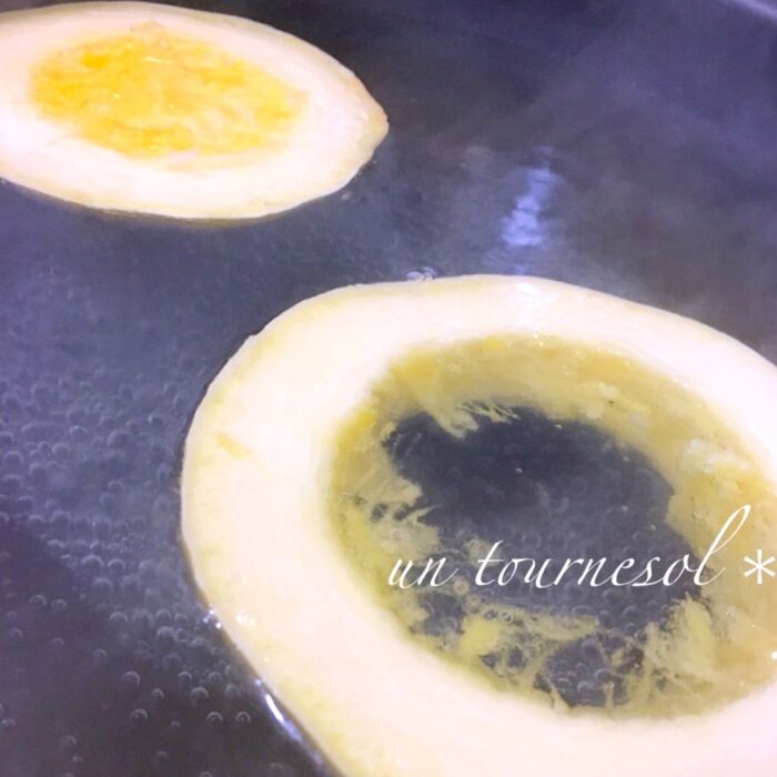 そうめん瓜は皮付きで輪切りにし、タネとワタをスプーンで取り除いて、沸騰したお湯で約10〜15分ぐらい茹で、水の中で親指で押し出すように取り出す。《中火》