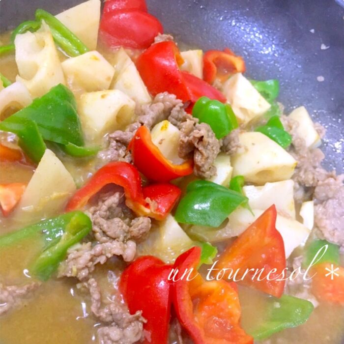 ピーマンはタネを取り除いて乱切りに、れんこんも乱切りにし、牛肉は一口大に切り、にんにくとしょうがはみじん切りにする。