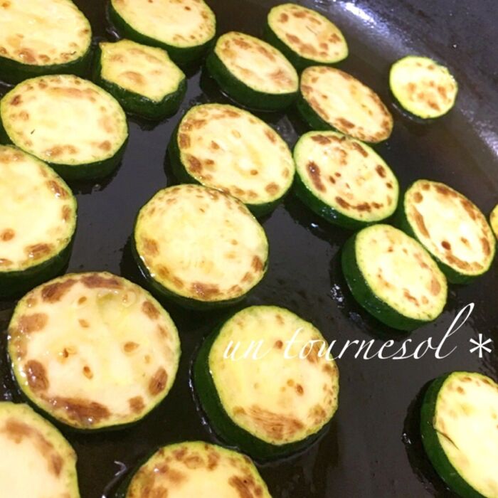 フライパンにオリーブオイルを入れて熱し、ズッキーニに少し焼き目がつくぐらいまで両面焼く。《中火》