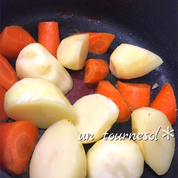 *じゃがいもとにんじんに、油がからむように炒めればOK!