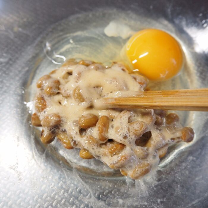 ボウルに納豆を入れ、よーくかき混ぜます。