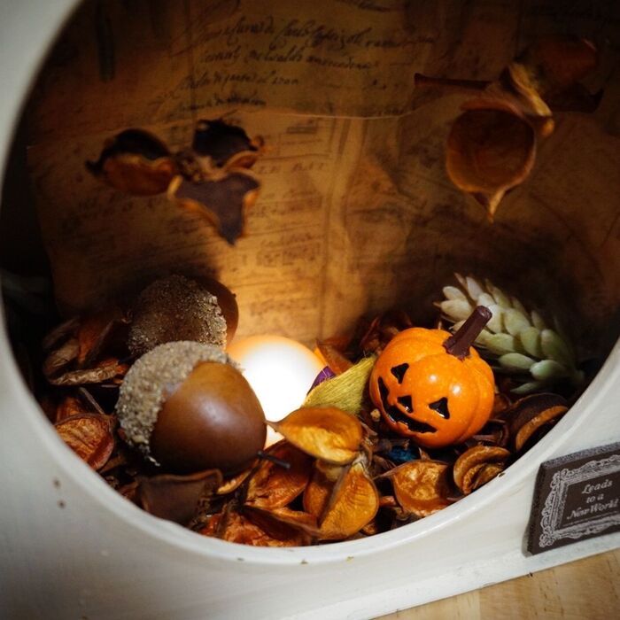 ぶら下げるポプリとライトがポイント。あるとグンと楽しい空間になります。