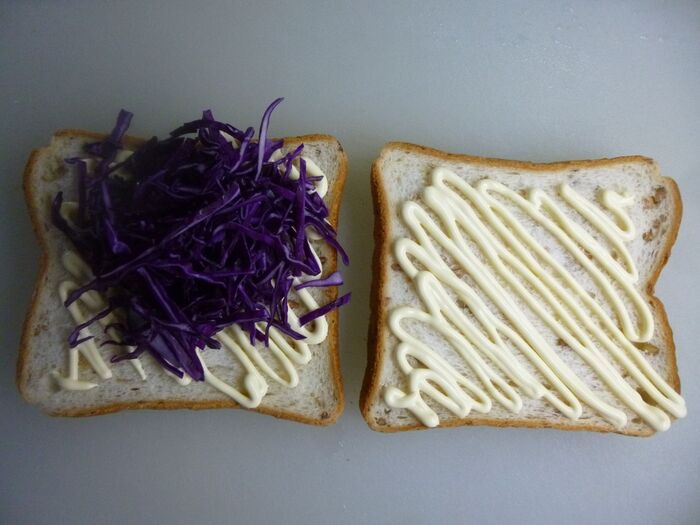 ①紫キャベツはフレンチドレッシングを小さじ2程度かけて混ぜて置く。