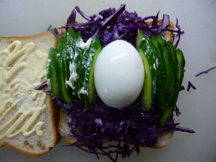 斜めに切った薄切りのきゅうりを卵の両脇にのせ、塩と胡椒を少々ふる。