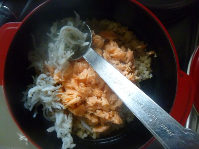 ほぐした塩鮭を①のお弁当箱のご飯の真ん中に置いて、市販のしらす干しを周りに散らします。