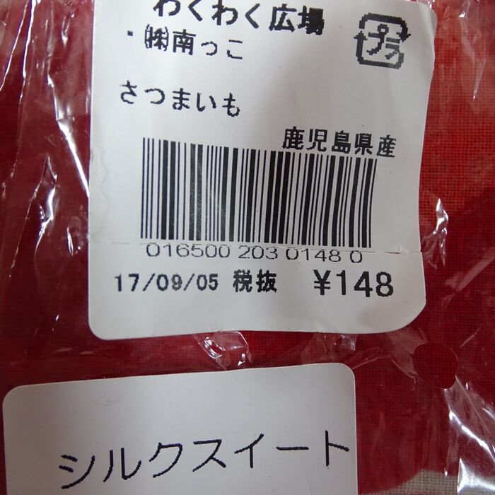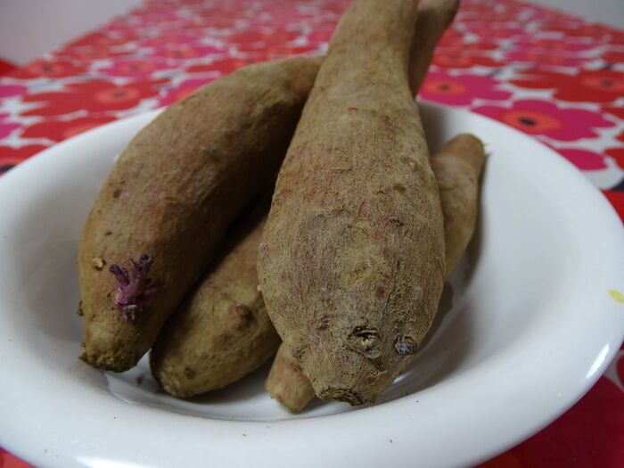 2種類のさつま芋は、皮をむいて大きめの乱切りにする。鍋に入れ・・・・冷たい揚げ油を入れる。