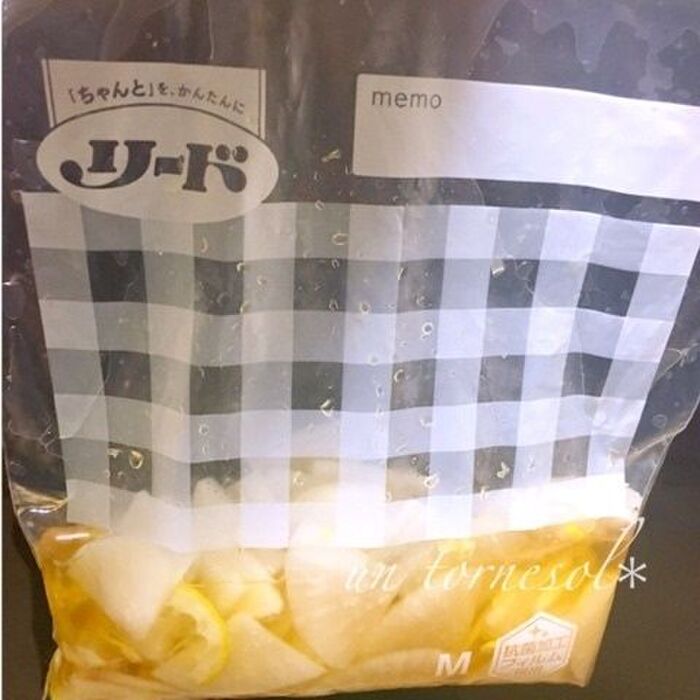 リードの保存バッグにレモンと☆を入れ、②の大根を入れて少しもみ、粗熱が取れたら冷蔵庫にいれて、冷やせば完成‼