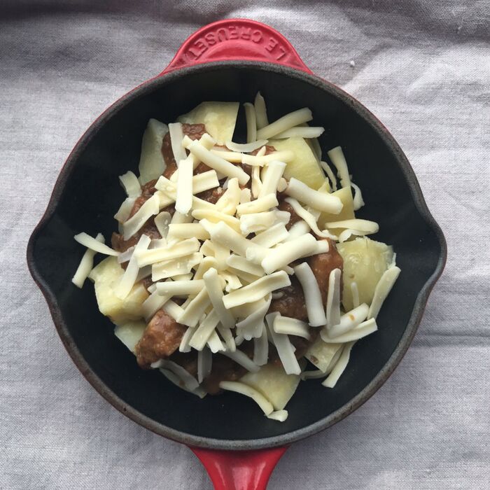 2. 耐熱皿に1を並べ、カレーをかけ、チーズを散らす。