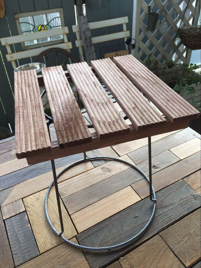 画像のようにウッドデッキパネルの裏側に、ポールプランタースタンドの小さい方の輪を当て、ステップルを数か所金づちで打ちます。