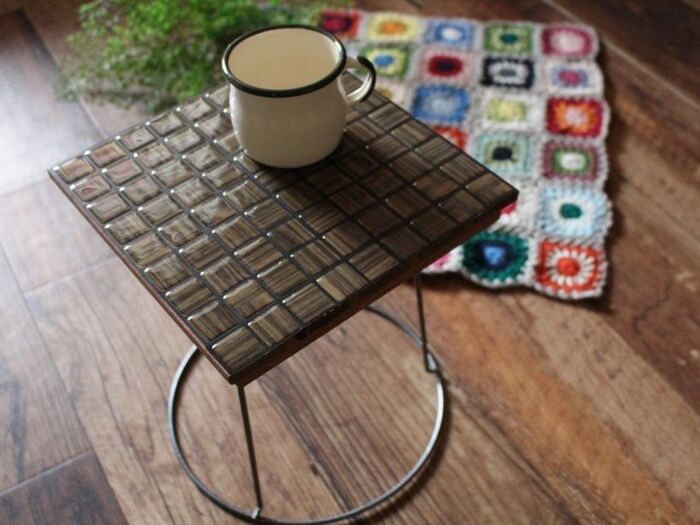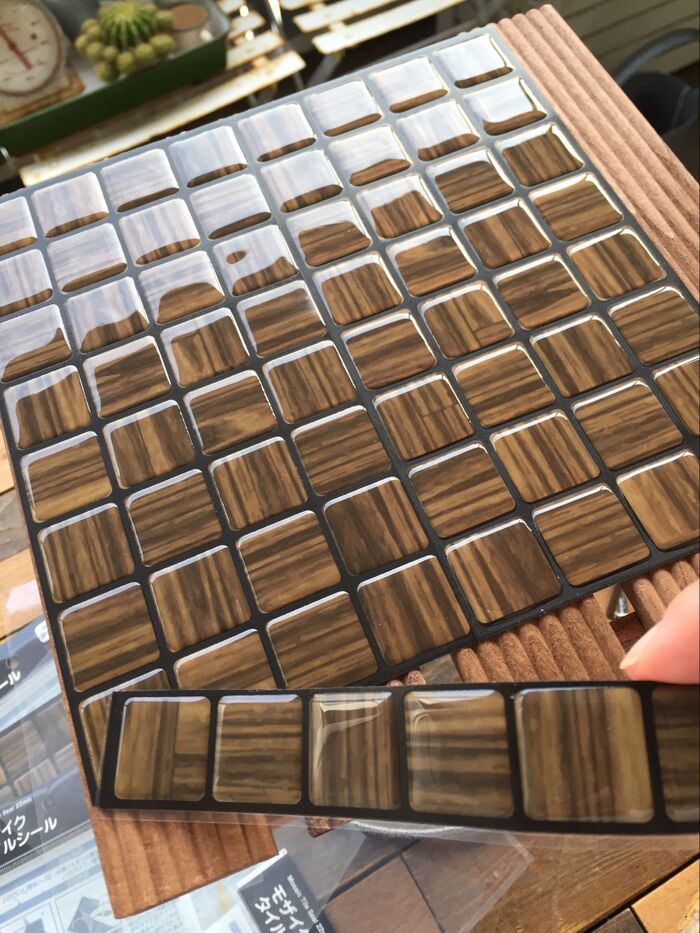 天板となるウッドデッキパネルに、モザイクタイルシールを貼っていきます。