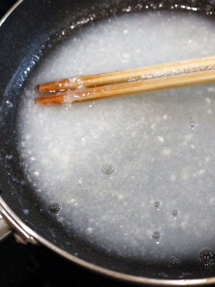 ②水1/2cupを沸騰させてから小麦粉大さじ1を加えてよく混ぜ、小麦粉のりを作る。
