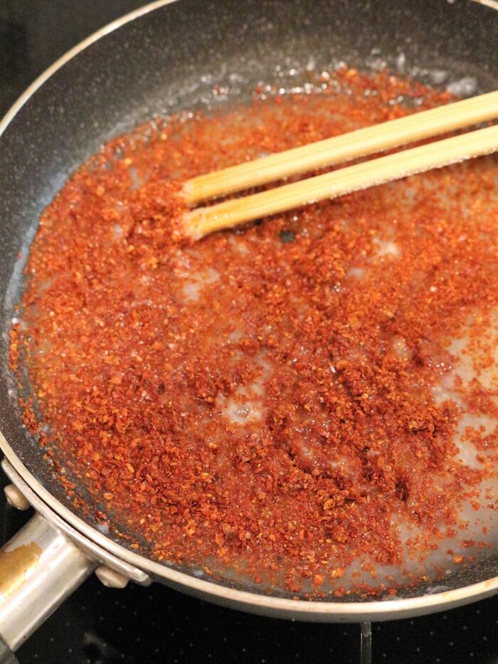 ③小麦粉のりが熱いうちに粉唐辛子を混ぜてから(赤の発色が良くなる)、Ⓐを混ぜる。