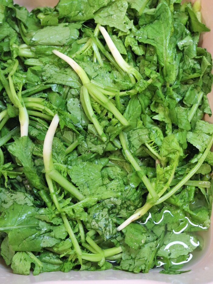 ①間引き大根は水で洗って2~3等分の長さに切り、塩水1Lで30分程漬けてから2回洗ってザルに上げる。