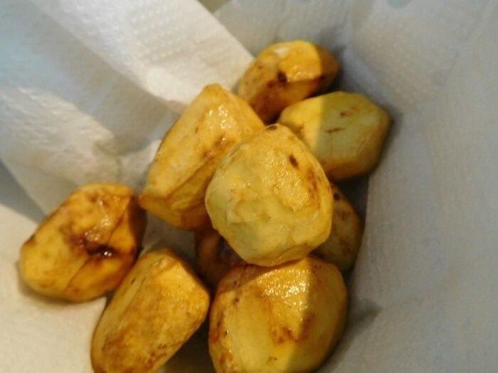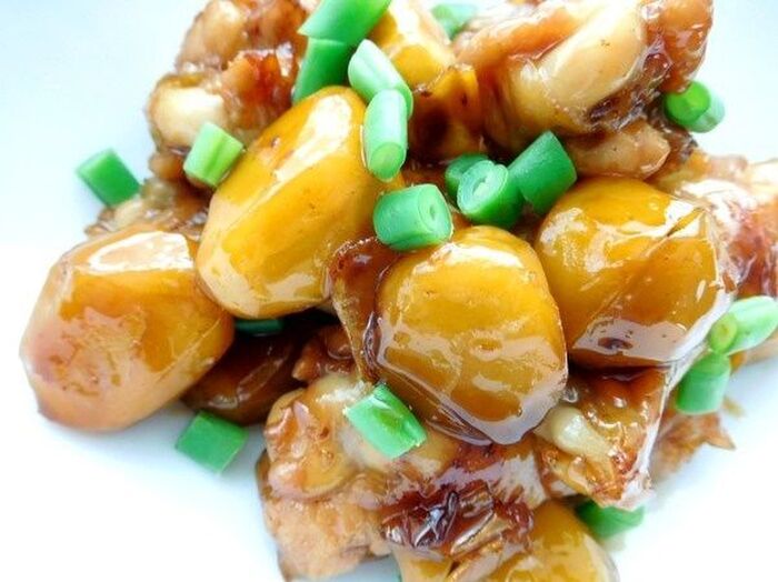 栗はたっぷりの熱湯で5分ぐらい茹で殻と渋皮をむき低めのオイルで3分ぐらい素揚げする