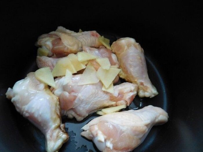 鍋にサラダオイルと下味をつけた鶏肉 薄くスライスしたしょうがを入れ鶏皮がカリッとするまで炒める