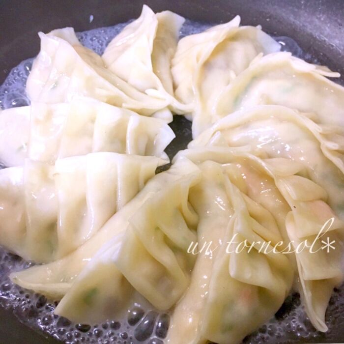 フライパンにギョーザを並べて、水(分量外 100ml)を一緒に入れてフタをしめて約5〜7分蒸し焼きにして、フタをとって水気がなくなれば完成‼︎《中火》