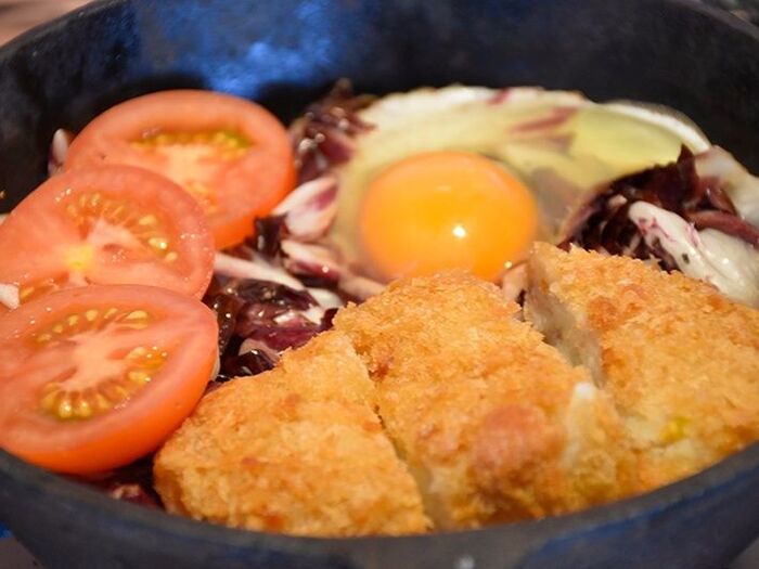 卵が好みの固さになったら蓋を取りソースをかけ、