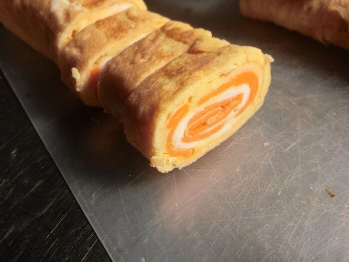 卵とサモかまを一緒に端から巻きます。