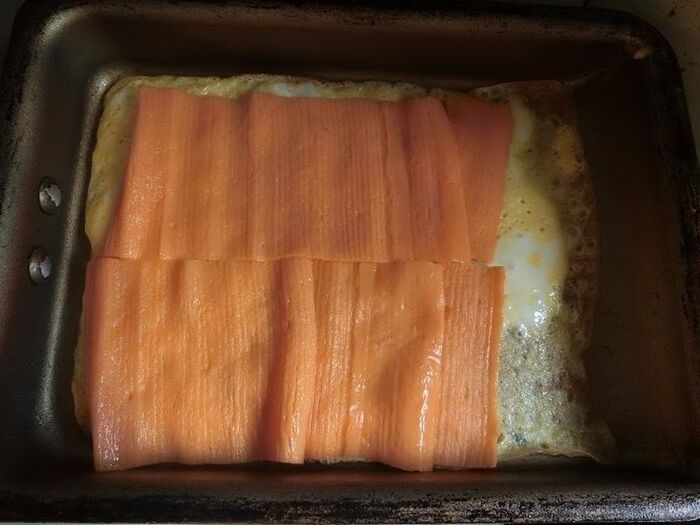 卵3個に砂糖を混ぜ合わせます。フライパンに油を敷き、卵を流し入れたら広げたサモかまを乗せます。