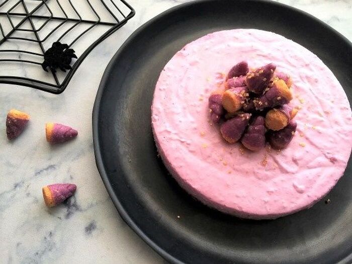 チーズケーキにも紫芋を加えているので同じ味の紫芋のたけのこの里を添えました。