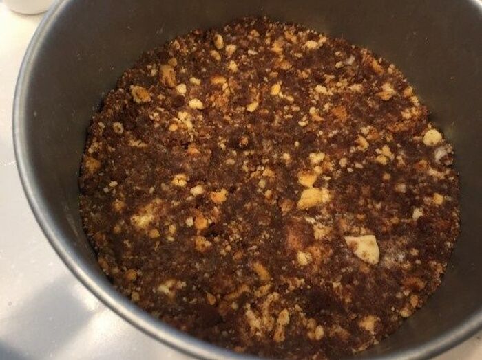 クッキーを細かく砕き室温に戻したバターと混ぜ合わせ型の底に敷き詰める