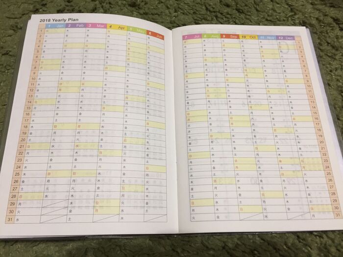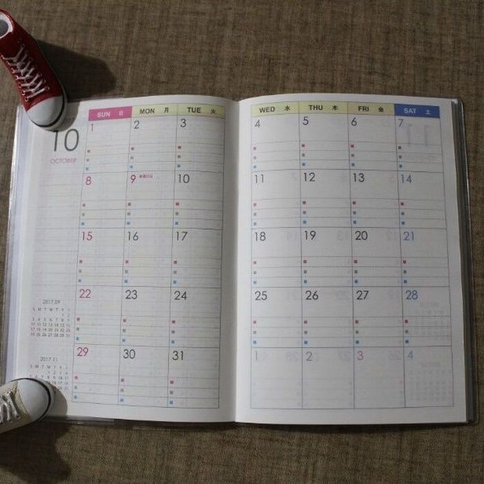 月間は日曜日始まりで、1日が4つの欄に分かれています。