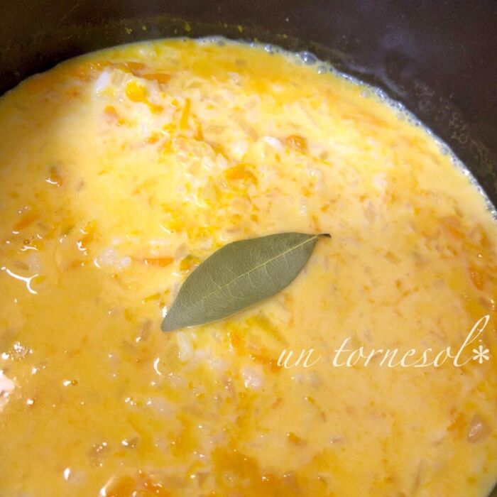 つぶしたかぼちゃと水・コンソメキューブを入れてひと煮立ちさせ、ごはんと牛乳・塩をいれて、時々混ぜ合わせながら煮込む。《中火→弱火》