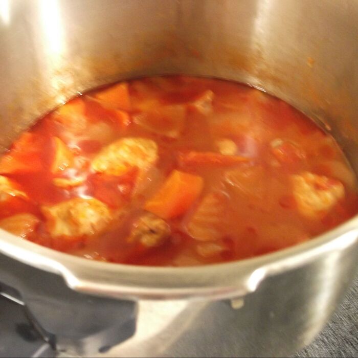 焼き目を付けた手羽元と玉ねぎを入れて軽く混ぜ、