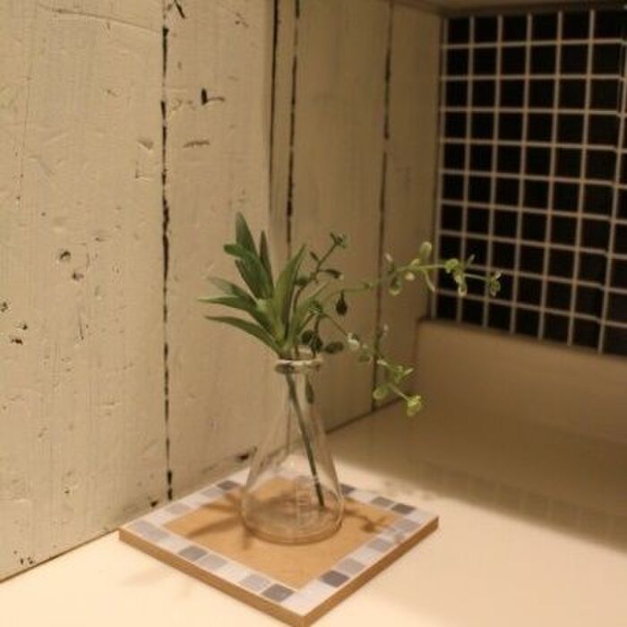 タイルシールの余りで作ったコースターは一輪挿し用に