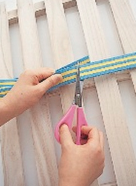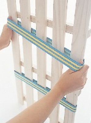 手芸店で売っている平ゴムを、たるまないようにすのこにしっかり固定してサイズを決め、ハサミで切る。同様にあと2本を作る。