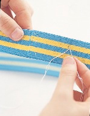 切り取った平ゴムの端同士を5㎝ほど重なるようにして、2本取りした糸で両端をしっかり縫い合わせ、わっか状にする。