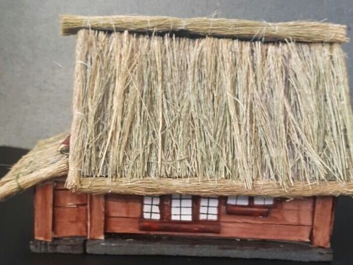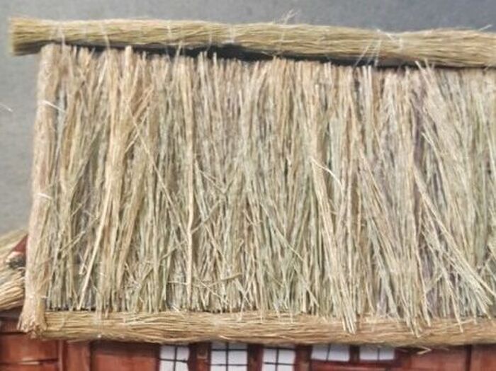 ⑥ 正面の屋根板の側面にも同様にしてホウキ草の束を透明ミシン糸で取り付ける。