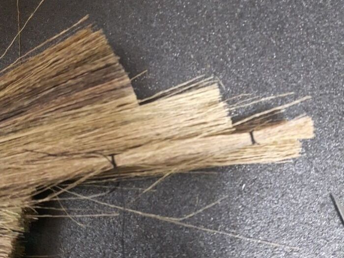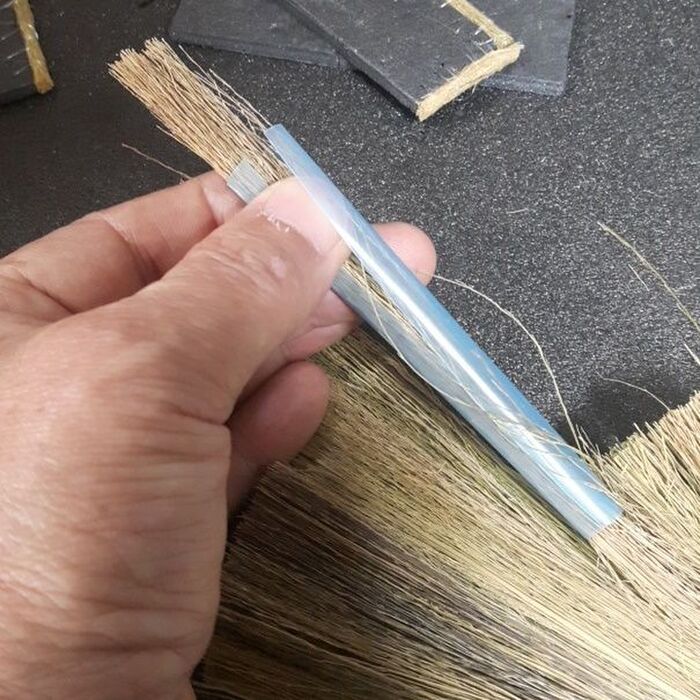 ⑤ 屋根の側面の左右と下の3面にホウキ草の束を針に透明ミシン糸を通して縫いつける様にして取り付ける。